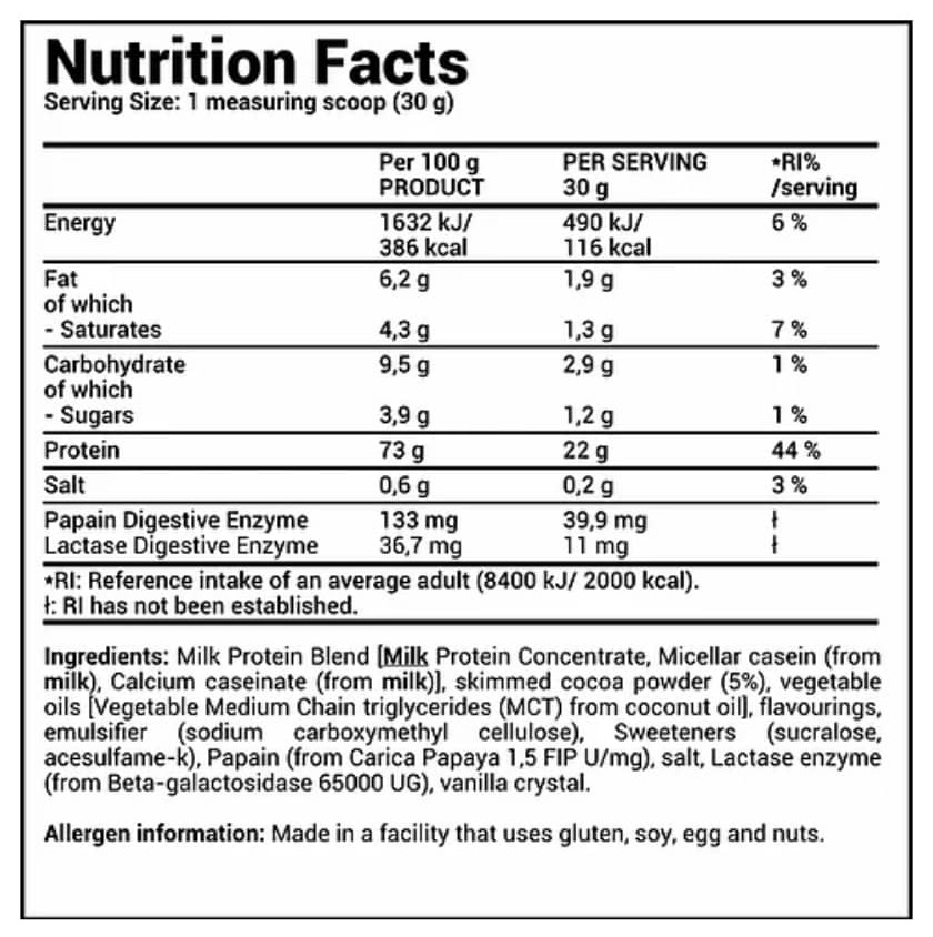 Il est préférable de prendre cette source de protéines à digestion lente avant de se coucher, pour une libération progressive pendant la nuit des acides aminés pendant le sommeil.
