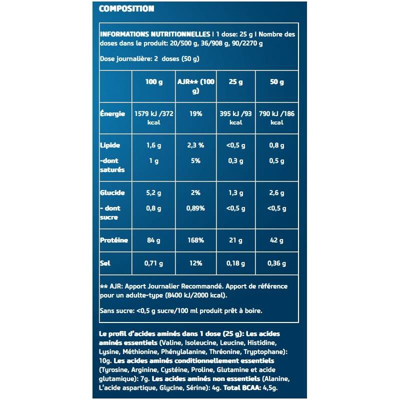 Iso Whey Zero, c’est 22g de protéine par portion, dont 5g de BCAA. Ce produit ne vous apporte rien de plus que des protéines très riches en BCAA.