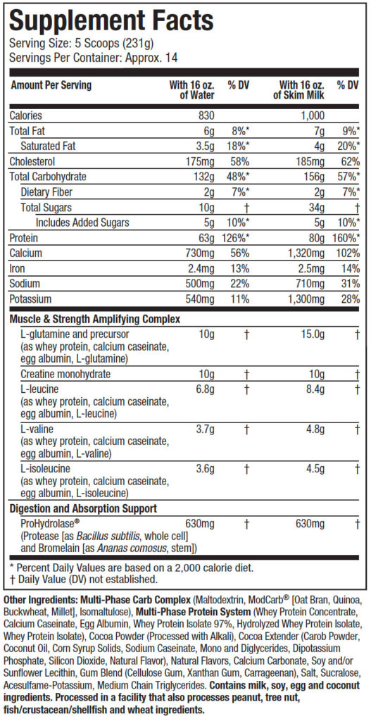 Lorsqu’il est mélangé avec 2 tasses de lait écrémé le Mass Tech Elite offre par serving :